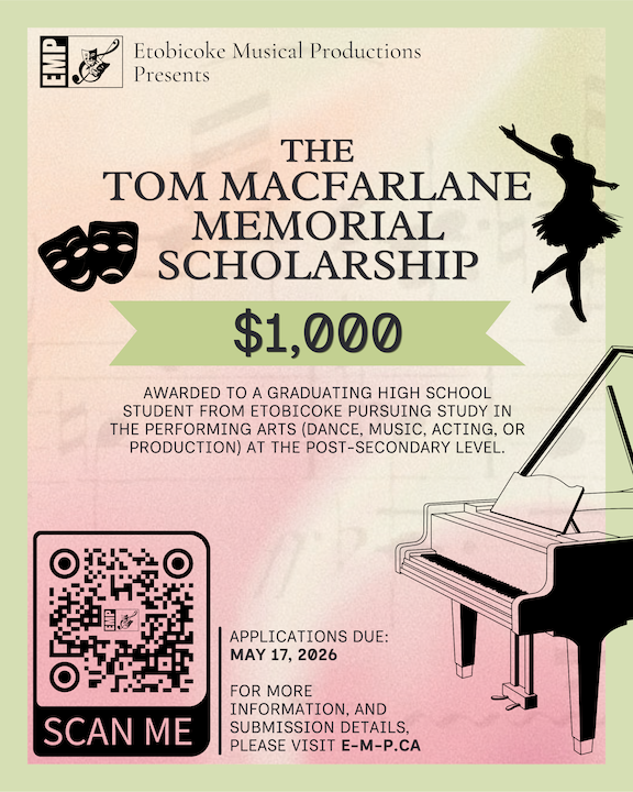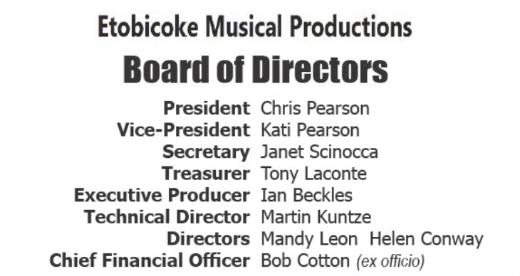 A Vibrant Not-for-Profit Theatre CompanyEtobicoke Musical Productions is a not-for-profit, community organization where a love for the arts takes center stage. We strive to provide our members with opportunities to perform, direct, choreograph, produce, and design quality music theatre. In doing so it is our mission to enrich the lives of our members and patrons by fostering an accessible outlet to engage in the performing arts.